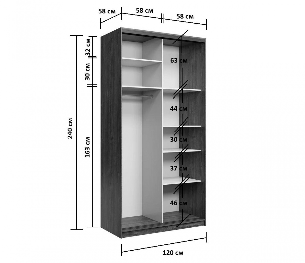 - Габаритные размеры проекта на фото (Ширина х Высота x Глубина) – 120 x 240 x 58 см.